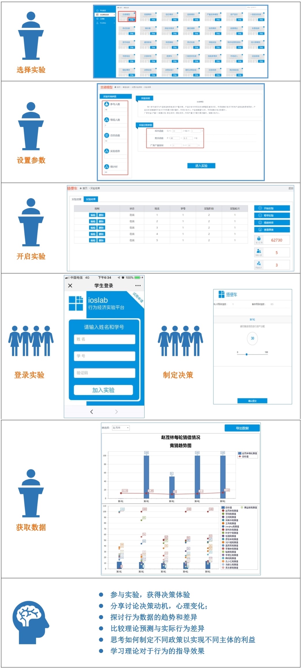 学生通过微信公众号(IOSLAB)参与教学实验,以“游戏”的形式体验案例角色的心理活动和行为动机; 以案例体验式的教学方式,促进学生主动理解和掌握经济管理活动中的基本原理,潜意识中提升对经济管理现象和问题的独立思考能和分析能力。 |